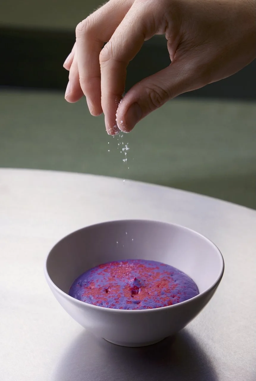 Highlights included a galaxy-like cabbage foam that shifted color with citric acid, glowing carrot planets orbiting elderflower hollandaise and a trilogy of pea creations developed through centrifugation, separating peas into water, butter, and starch — each component reimagined into its own dish.